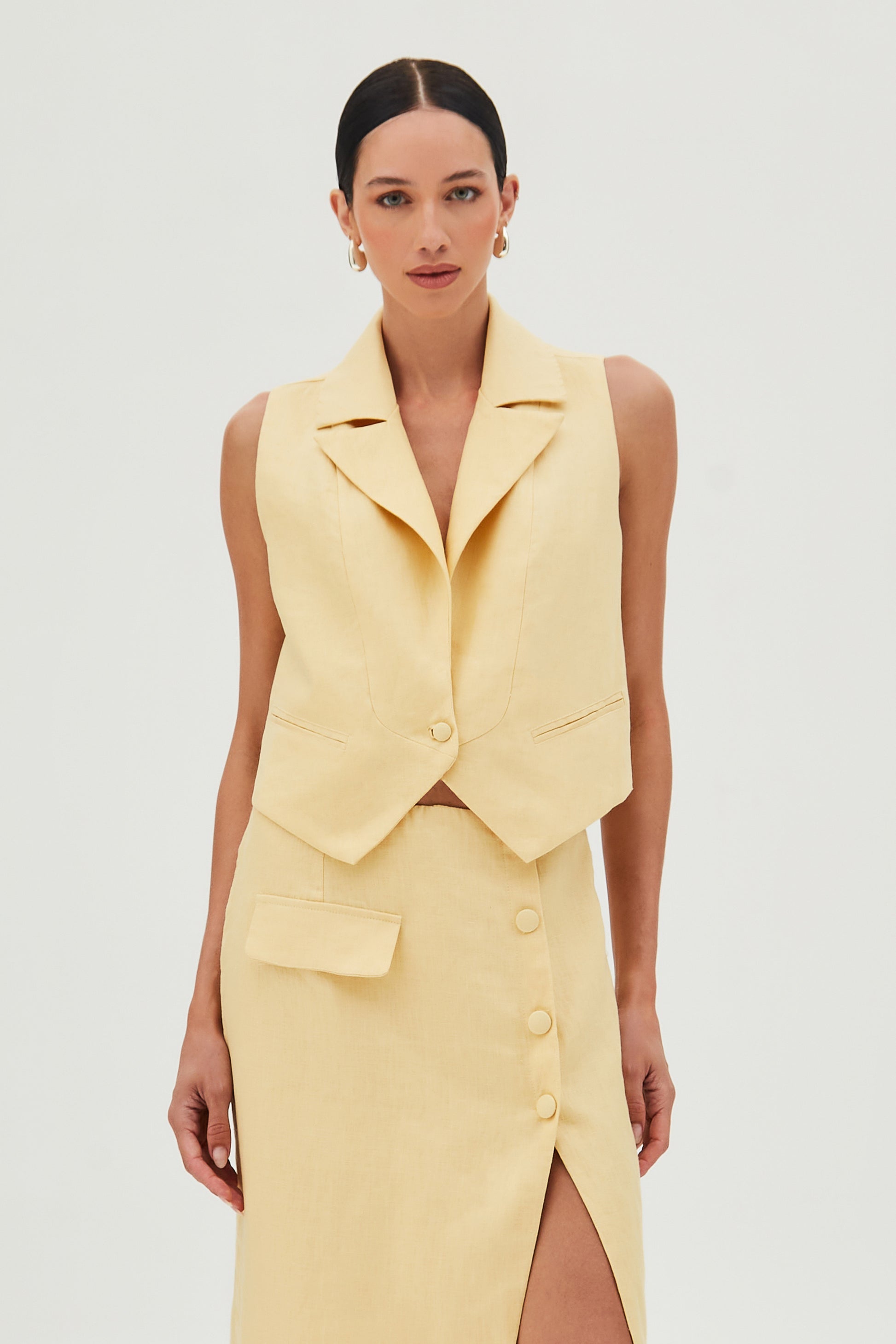 Blusa confeccionada em linho na cor Amarelo Manteiga. Peça possui modelagem reta, a peça conta com decote tradicional, recorte barra e costas e fechamento frontal por botão.