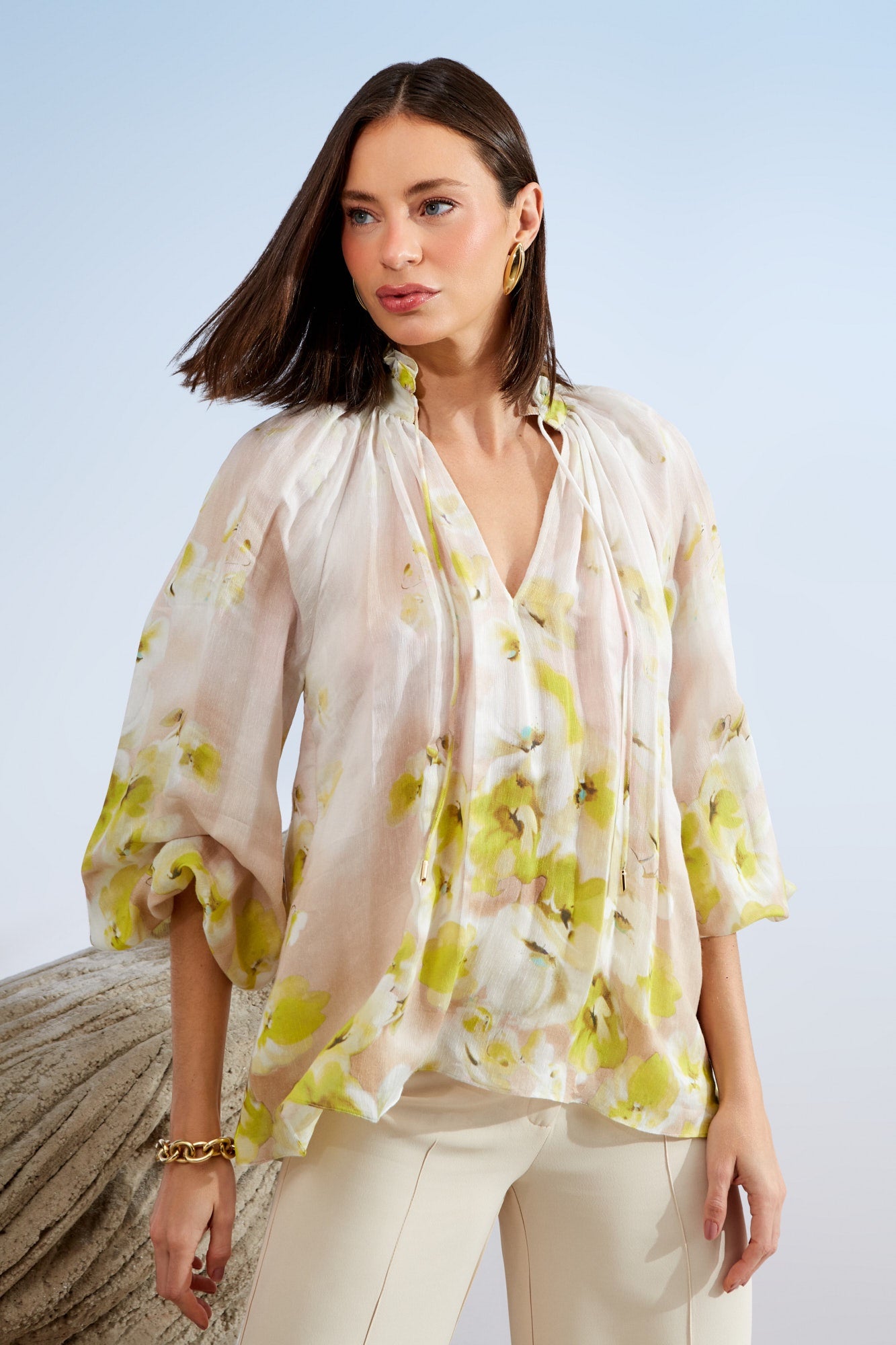 Blusa com estampa floral em tons de offwhite, amarelo e verde, em tecido misto com linho. Modelo com mangas amplas e detalhe de amarração na gola.