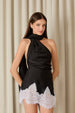 Blusa em cetim com pregas no ombro e faixa fluida na gola.