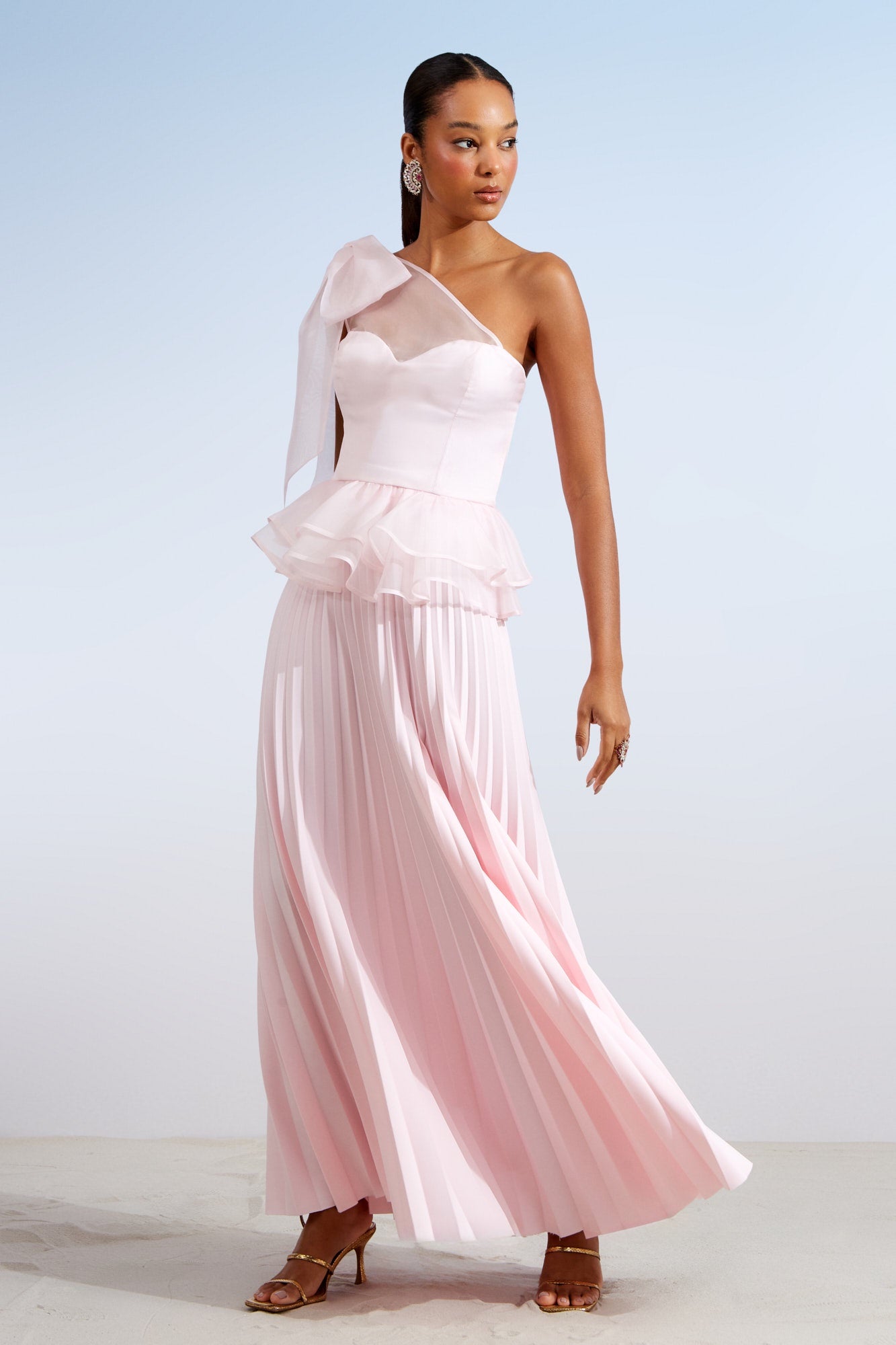 O tom de rosa claro transmite suavidade e romantismo, tornando a blusa ideal para produções sofisticadas.