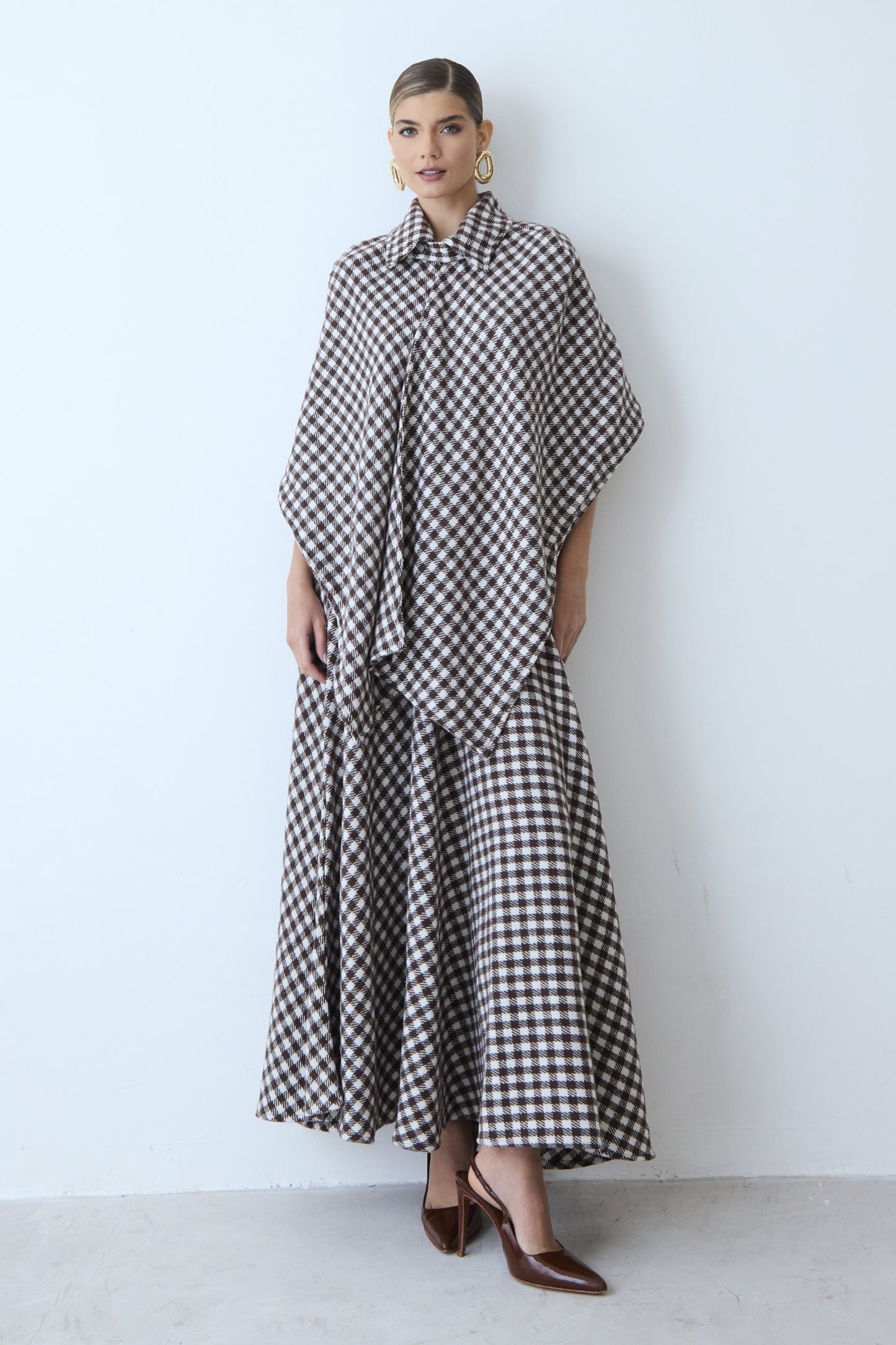 Blusa de manga curta estilo poncho, com estampa xadrez que traz um ar clássico e contemporâneo ao visual. O design transpassado valoriza a silhueta com leveza, enquanto a gola tradicional acrescenta um toque elegante e bem-acabado à peça.