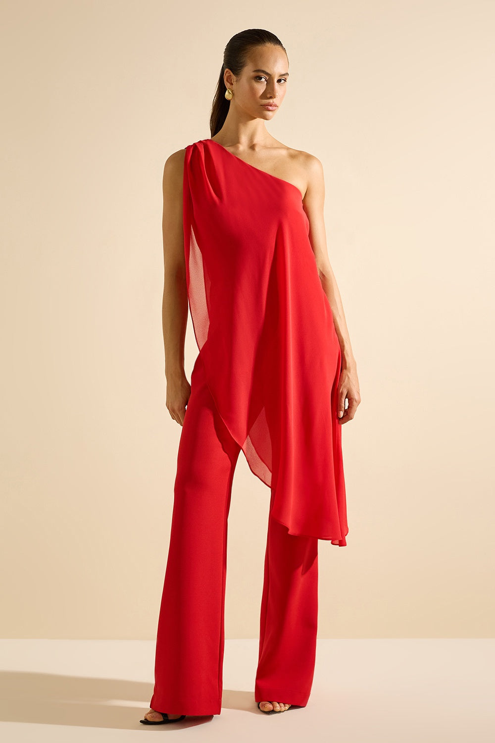 Macacão é a definição de elegância moderna. Com um design assimétrico de um ombro só, ele oferece um visual contemporâneo e chique. O detalhe da capa de chiffon sobreposta no topo adiciona um toque de movimento e profundidade, enquanto o macacão confeccionado em crepe estruturado garantem conforto e uma silhueta sofisticada. É ideal para eventos formais ou celebrações noturnas, proporcionando uma alternativa estilosa aos tradicionais vestidos de festa.