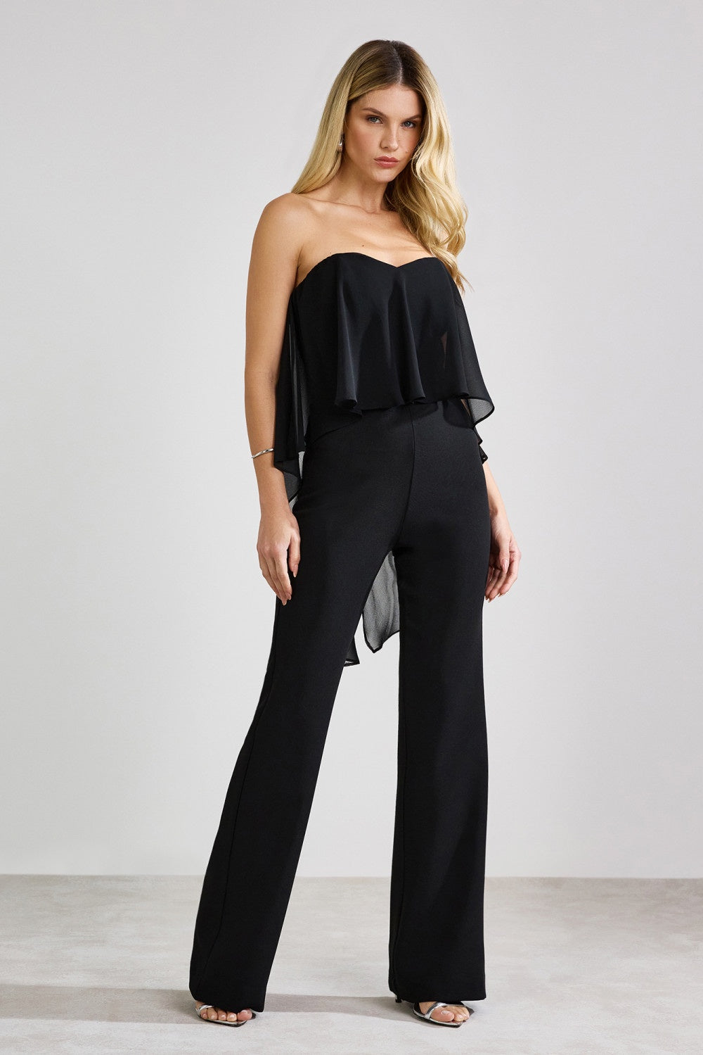 O equilíbrio perfeito entre modernidade e sofisticação. Este macacão de alfaiataria apresenta modelagem reta com caimento impecável e um design tomara que caia, ideal para valorizar os ombros e o colo com leveza. A parte superior conta com uma sobreposição fluida em tecido leve, criando movimento e um visual delicado e elegante. Nas costas, a sobreposição ganha destaque com um recorte central mais alongado, proporcionando charme extra à peça. A modelagem pantalona confere conforto e sofisticação, ideal para ocasiões que exigem estilo com elegância.