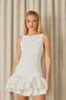 O tom off white reforça a estética minimalista da peça, destacando a textura do crepe e o volume dos babados.