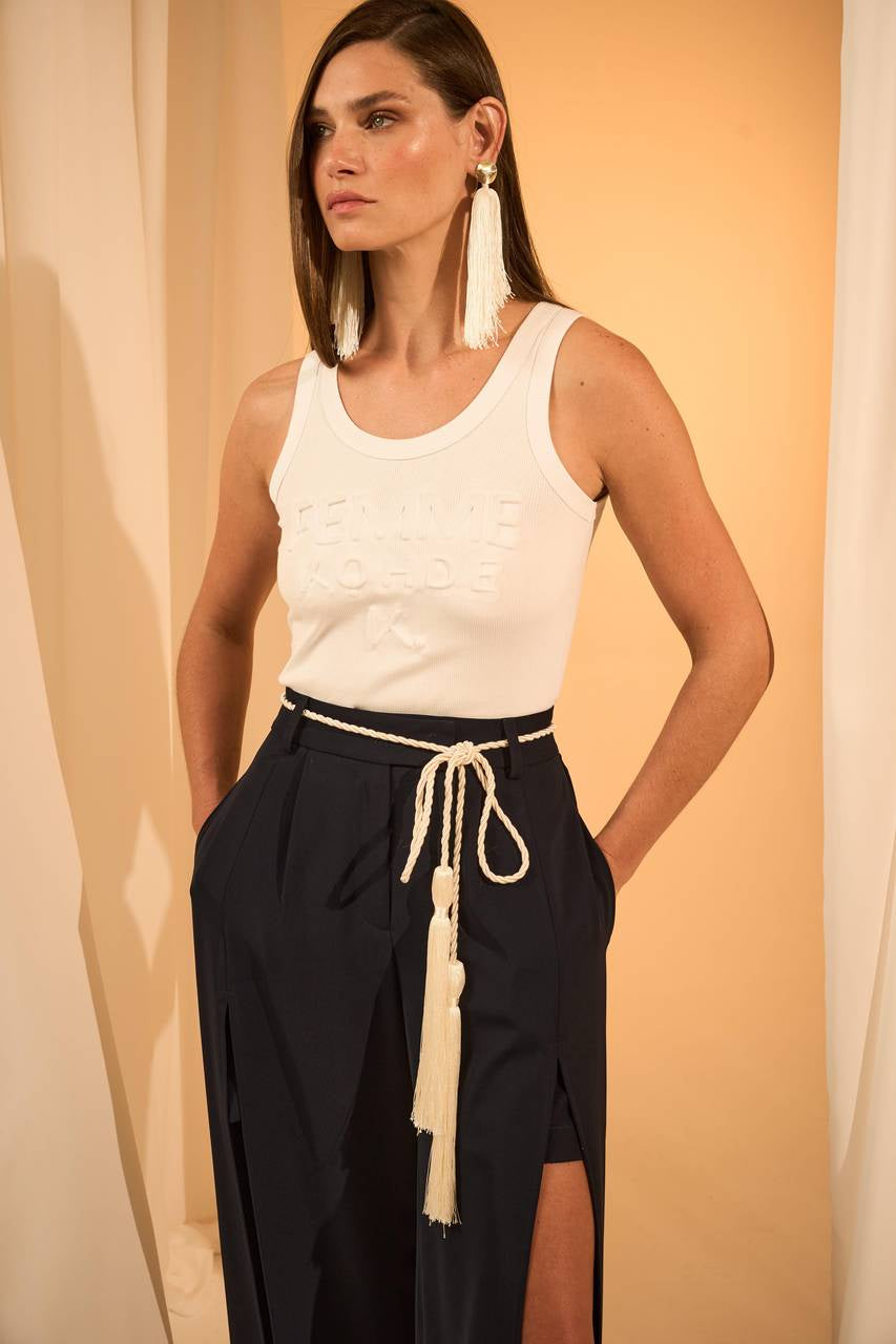 Regata em malha canelada com modelagem justa ao corpo. O destaque da peça é o bordado em relevo com a frase "FEMME" e outros caracteres estilizados, trazendo uma pegada minimalista porém com identidade marcante. O decote redondo e as cavas mais abertas reforçam o estilo casual, enquanto a combinação com uma calça prateada cria um contraste moderno e ousado. Ideal para looks descomplicados com um toque fashionista.