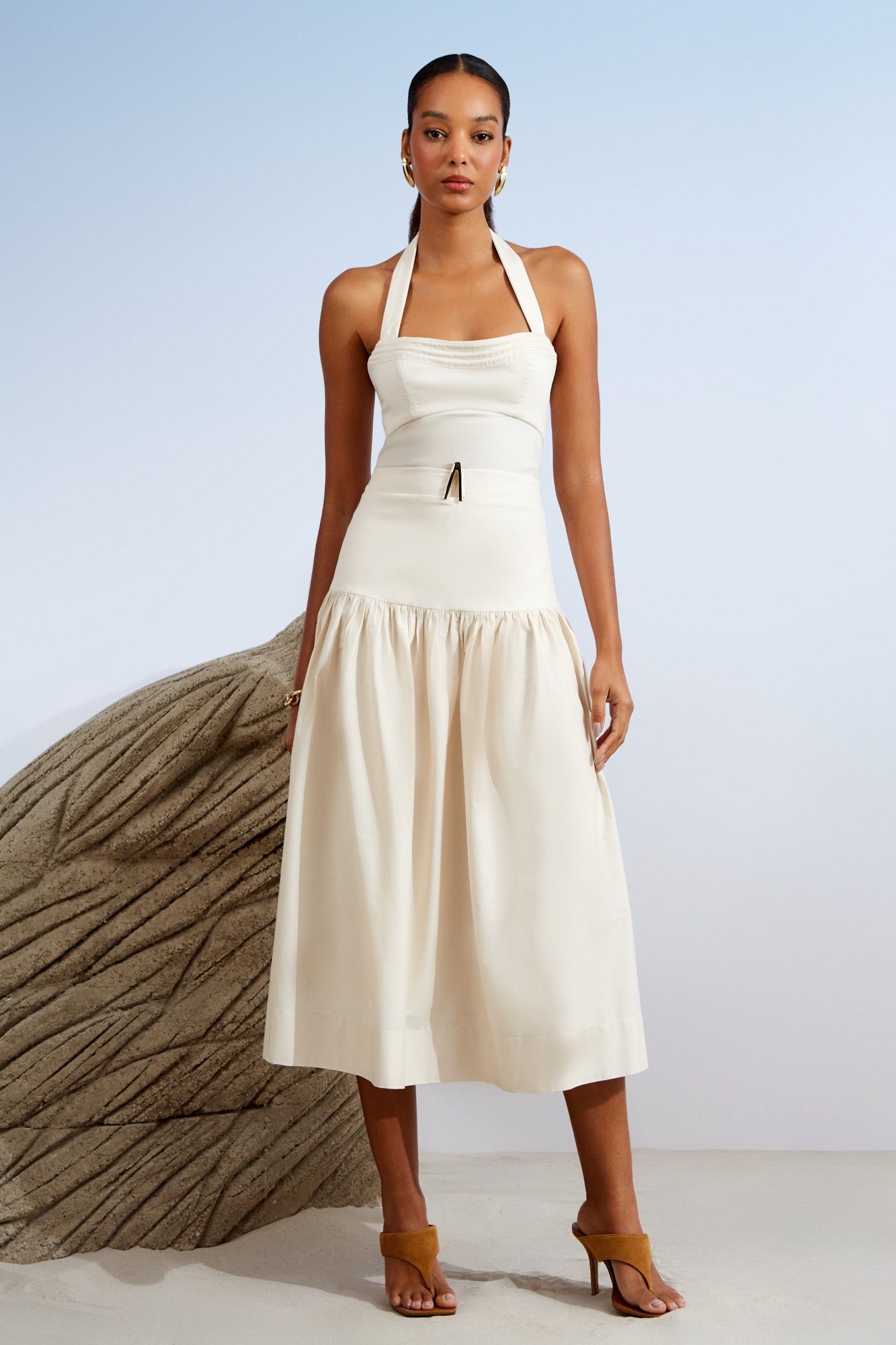 Saia midi creme em tecido de tricoline, cintura alta com detalhe de metal. O modelo possui corte evasê e pregas.