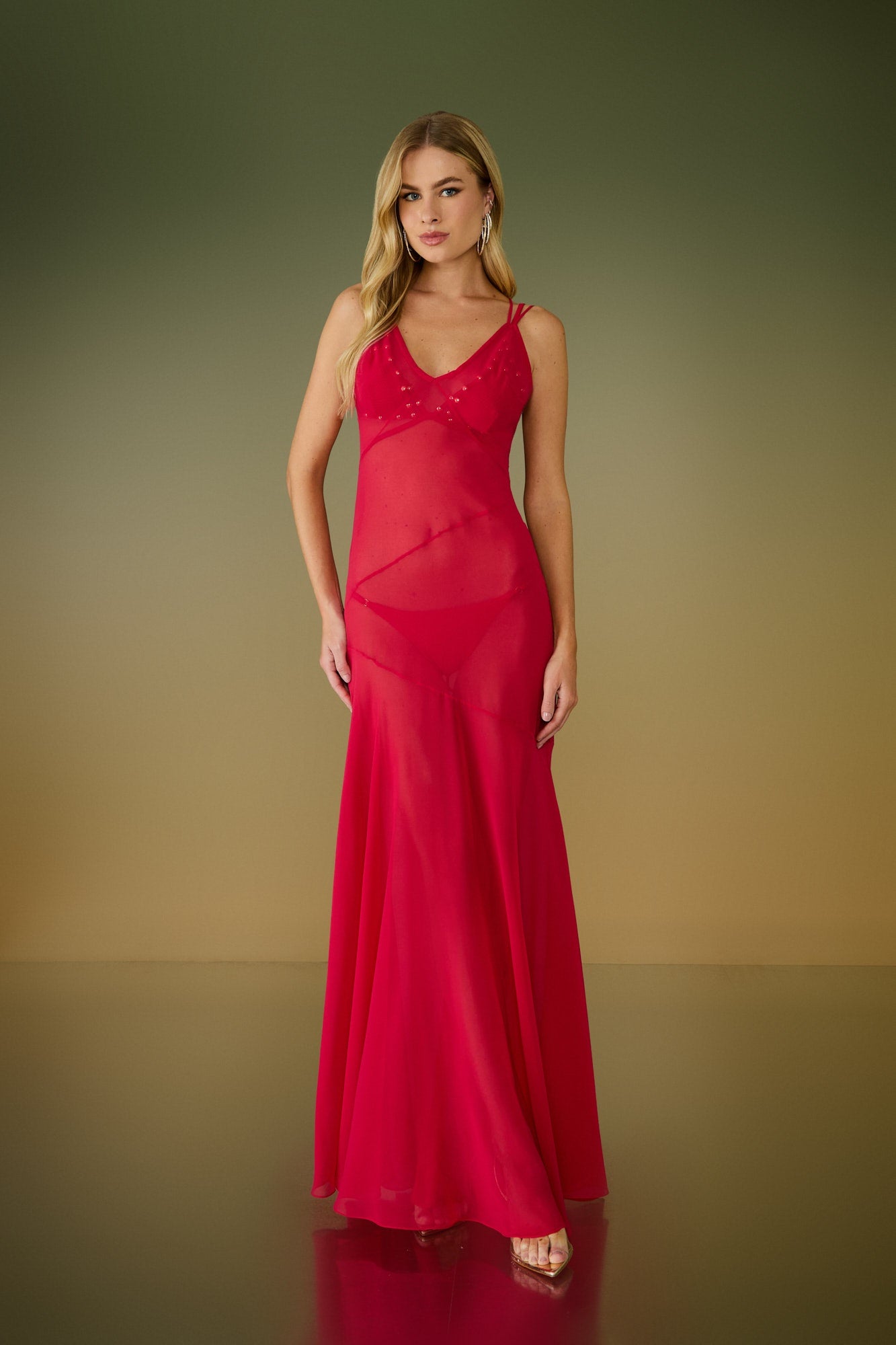 Saida de praia longa confeccionada em chifon e modelagem ajustada no corpo e ampla na saia com recortes estratégicos. Sem mangas, decote V, duas alças com reguladores - uma finalizando na cava e uma cruzando no decote bem amplo das costas – e zíper invisível central nas costas para fazer fechamento da peça. Acompanha underwear em viscose com a mesma modelagem da peça principal.