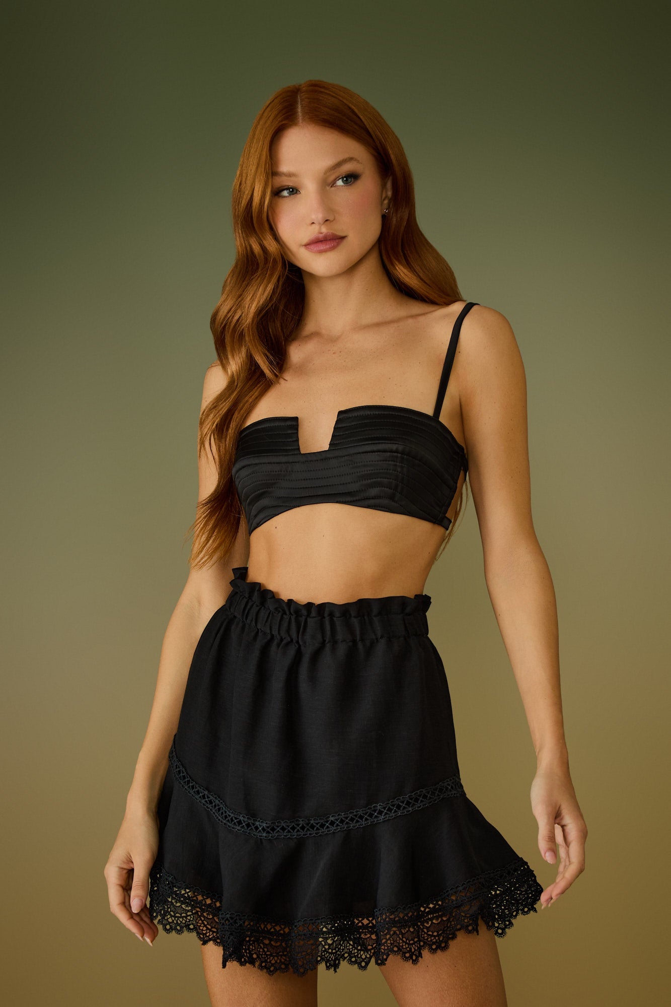 O pesponto horizontal cria uma textura sutil e discreta no tecido. Como isso afeta a modelagem? Adiciona estrutura e ajuda o top a manter o formato, valorizando o busto.