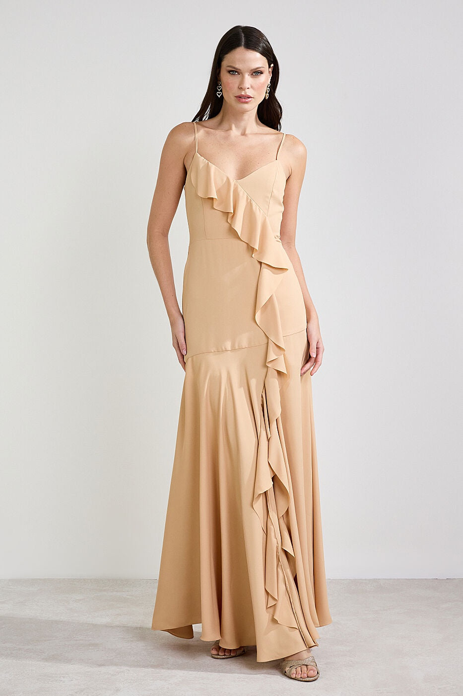 Vestido Cascata; Decote V Modelagem acinturada Modelagem da saia ampla Babado no comprimento frente Zíper invísivel centro costas Tecido de crepe com leve transparência.