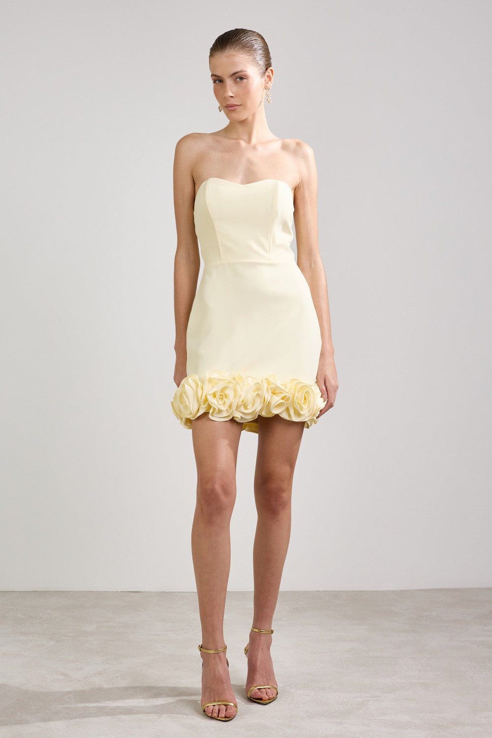 Moderno, romântico e cheio de charme, este vestido curto tomara que caia é perfeito para quem busca um look elegante e feminino. Sua modelagem é ajustada ao corpo, valorizando a silhueta, com decote coração que traz delicadeza e sofisticação. O grande destaque da peça está na barra com aplicação de flores em tecido, que conferem um toque romântico, criativo e diferenciado, tornando o visual único e memorável. Na parte de trás, o vestido possui fechamento com zíper invisível, garantindo praticidade e acabamento refinado. O design tomara que caia proporciona um colo livre, perfeito para valorizar acessórios e criar produções elegantes.