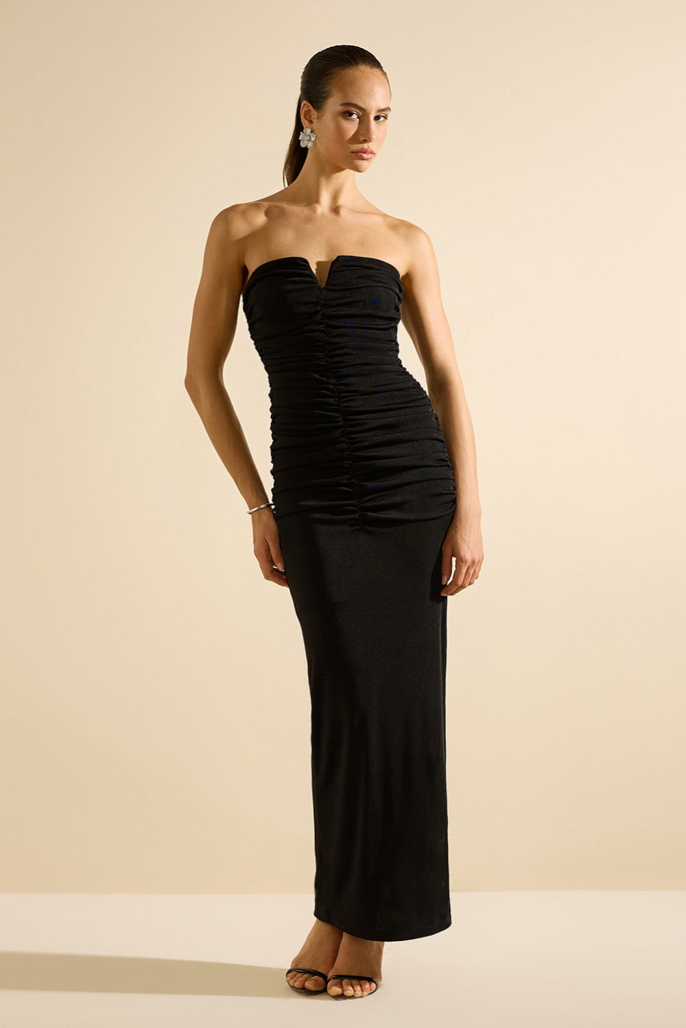 Encante-se com a elegância deste vestido longo confeccionado em malha encorpada e confortável, que modela o corpo com perfeição. O busto apresenta um decote coração estruturado, valorizando o colo de forma sofisticada. A parte frontal é inteiramente drapeada com franzidos verticais estratégicos, criando um efeito alongado e esculpido. O comprimento midi longo completa o visual com um toque refinado e moderno. Na parte de trás, o vestido mantém o design tomara que caia com caimento ajustado e drapeados que acompanham as curvas do corpo até o quadril. A modelagem é reta e segue fluida até a barra, proporcionando sofisticação sem abrir mão do conforto. O tecido de malha oferece elasticidade ideal para liberdade de movimentos e excelente caimento.