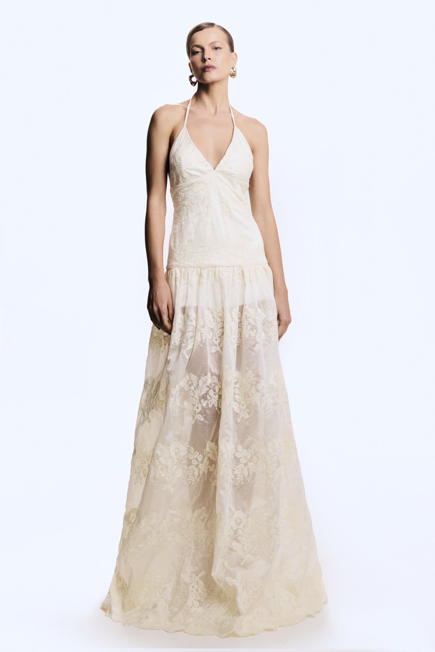 VESTIDO LONGO BORDADO COM RECORTE BUSTO ACINTURADO COLEÇÃO VERÃO 26