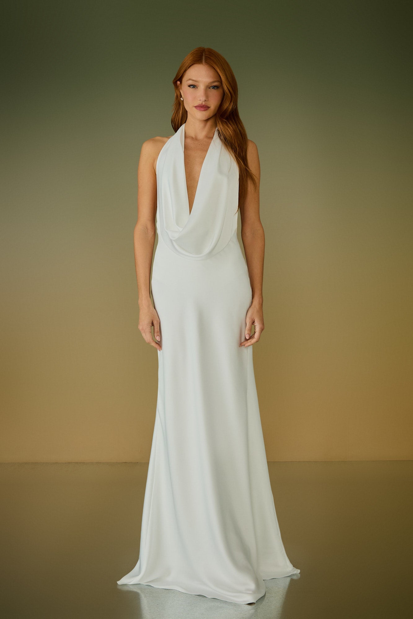 Referencia: 170313  Coleção: Alto Verão 26    Vestido longo confeccionado em cetim e modelagem ajustada no corpo...