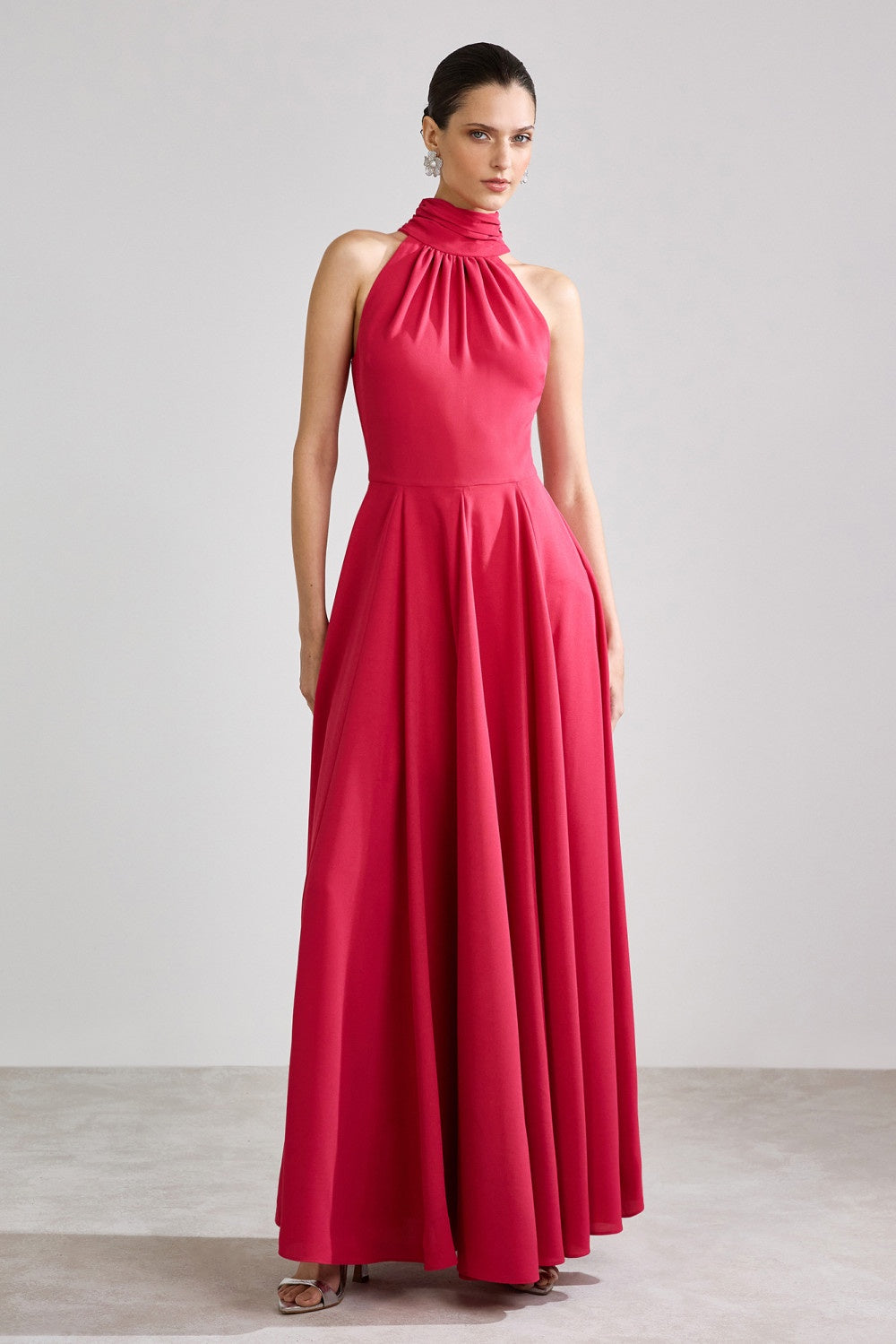Vestido longo confeccionado em tecido leve e fluido, em cores vibrantes, que proporciona movimento elegante à peça. O modelo apresenta decote halter alto com delicadas pregas no busto, valorizando a região do colo e ombros de forma sofisticada. A cintura é levemente marcada, realçando a silhueta de maneira sutil e feminina. A saia longa possui caimento amplo e fluido, garantindo leveza e sofisticação em cada passo. Nas costas, o vestido segue o mesmo recorte do decote halter, com abertura discreta na parte superior das costas e fechamento por botão delicado na nuca. Perfeito para eventos sociais, casamentos, formaturas e festas que pedem um look elegante e atemporal.
