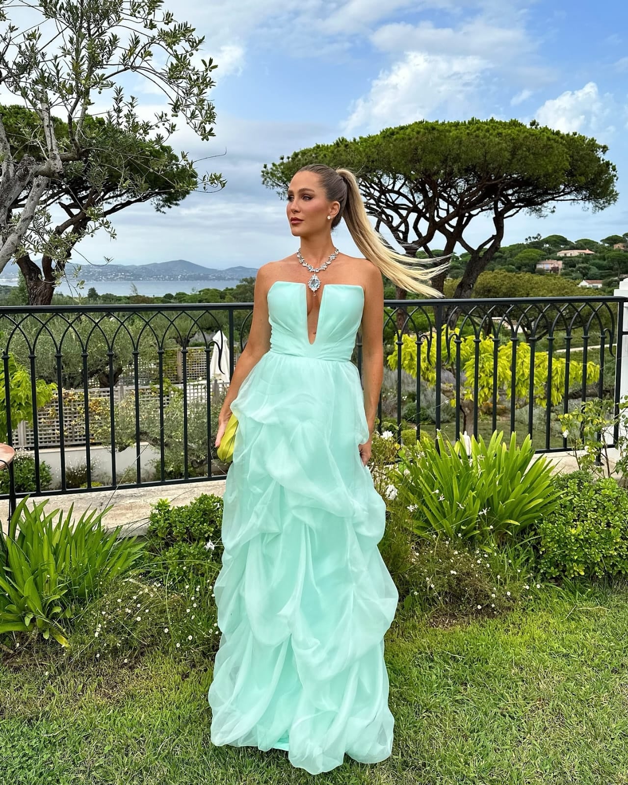 Este vestido longo em verde menta, confeccionado em organza de seda pura, é a combinação perfeita de elegância e sofisticação. A organza, com sua leveza e transparência, proporciona um caimento impecável, ideal para graças especiais e eventos glamourosos.