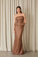 Vestido longo na cor camel, confeccionado em paetê. O modelo possui silhueta ajustada, saia evasê, decote tomara que caia com design rebaixado nas laterais e volume estruturado no quadril.