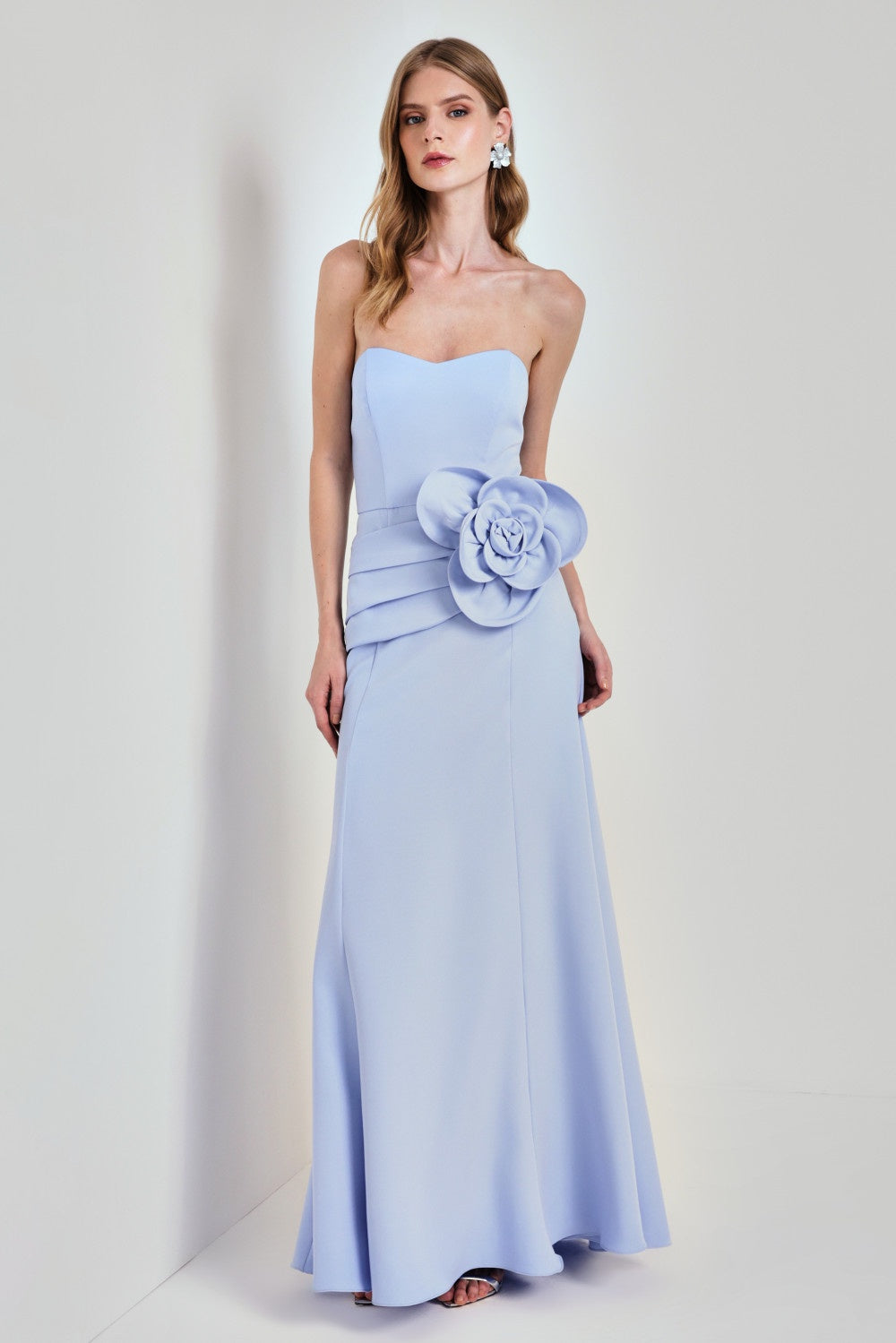 Vestido longo tomara que caia em crepe, com caimento impecável e toque sofisticado. A peça possui detalhe franzido na cintura que valoriza a silhueta e uma maxi flor aplicada lateralmente, que traz um charme romântico e super fashionista ao look. O recorte levemente evasê na saia garante leveza e movimento à produção, perfeito para eventos formais ou festas ao ar livre. Modelo com fechamento em zíper invisível nas costas para melhor ajuste ao corpo. A parte de trás mantém o shape clean e elegante, acompanhando o caimento fluido da saia com leve abertura na barra, garantindo conforto e sofisticação em todos os ângulos.