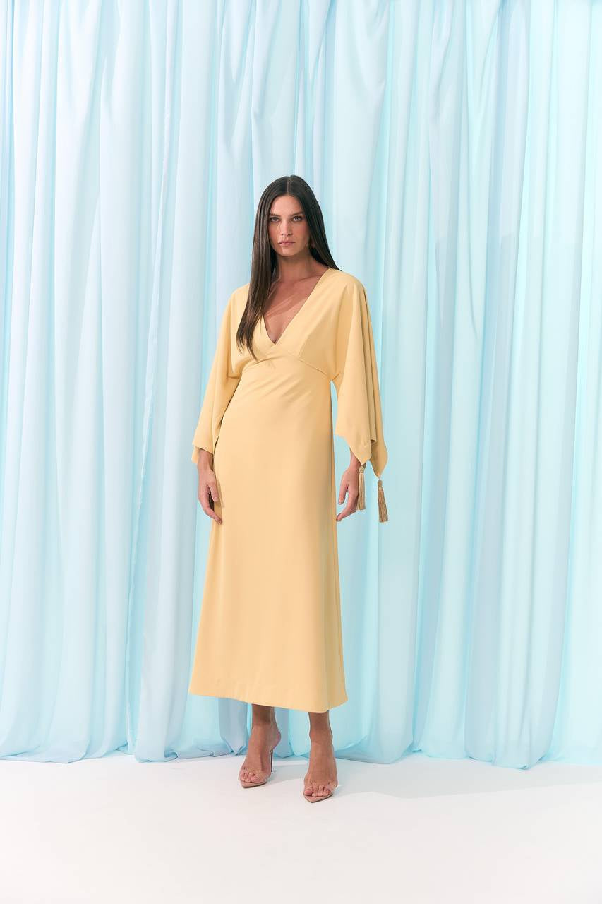 Vestido midi com decote em V e mangas amplas estilo quimono, finalizadas com delicados tassels. A modelagem fluida e o caimento leve criam uma silhueta elegante e confortável, perfeita para ocasiões especiais em climas amenos. Com um toque de sofisticação descontraída, é ideal para mulheres que valorizam design minimalista com detalhes marcantes.
