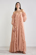 Decote lucille; Decote coração Babados no decote. Mangas compridas amplas. Modelagem ampla; Babados no comprimento do vestido. zíper no centro lateral; Forro fixo; Tecido de chiffon com toque de seda.