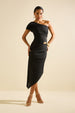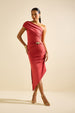 Vestido midi um ombro só, com modelagem drapeada que valoriza a silhueta. Possui detalhe de fivela dourada no centro, trazendo um toque sofisticado e moderno. O caimento ajustado ao corpo garante elegância e destaque. Parte traseira em corte assimétrico de um ombro só, com leve drapeado que acompanha o quadril. O vestido conta com fenda discreta, proporcionando conforto e liberdade de movimento sem perder a sofisticação.