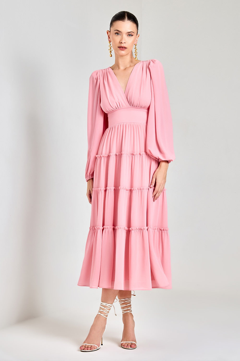 Elegante vestido midi com manga puff, possui uma saia ampla em camadas e babados delicados, o vestido é adornado por uma pala acinturada, realçando sua feminilidade de forma encantadora. O tecido escolhido possui leve transparência, proporcionando toque delicado e uma sensação de frescor ao look. Para uma combinação perfeita, sugerimos usar um salto delicados que ajudarão a alongar a silhueta, e uma linda bolsa para complementar o visual com estilo e sofisticação.