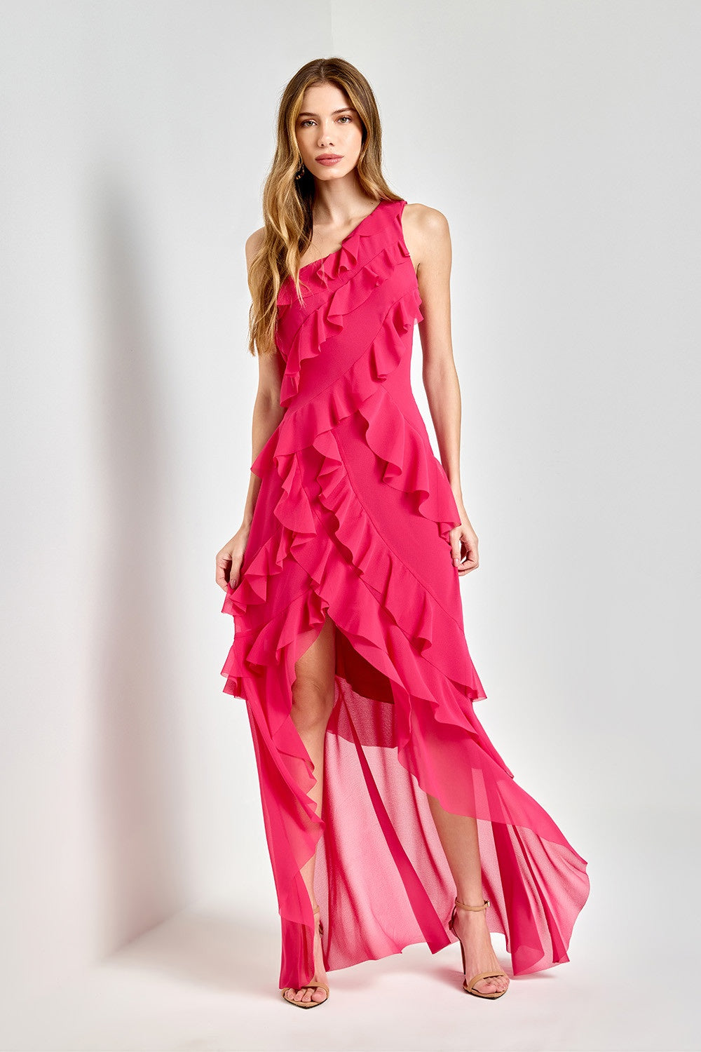 Vestido confeccionado em chiffon, com modelagem ajustada e fluída. O design de um ombro só traz um toque sofisticado, complementado por babados em todo comprimento do vestido, proporcionando versatilidade, e exclusividade ao look. O caimento leve e esvoaçante valoriza a silhueta, garantindo elegância e movimento.