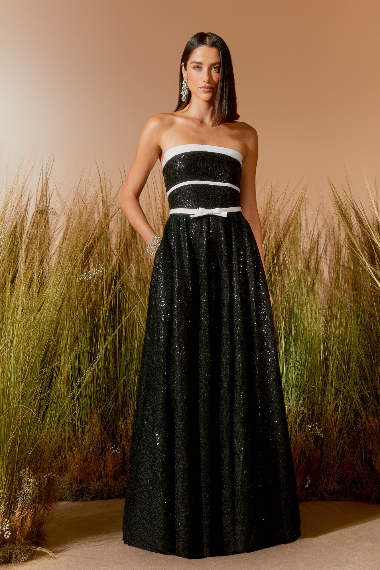 Vestido longo preto desenvolvido em paetê, modelagem tomara que caia com decote reto, recortes contrastantes no busto em off white e cinto fino com detalhe em laço. Saia ampla e fechamento posterior por zíper.
