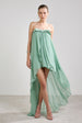 Este vestido é confeccionado em chiffon, com modelagem solta e comprimento mullet, que é curto na frente e longo nas costas. O destaque fica para o decote sem alças adornado por um laço estruturado. Uma peça versátil, perfeita para ocasiões especiais.