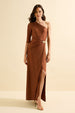 Vestido longo de um ombro só, confeccionado em tecido com leve brilho e caimento sofisticado. Possui 1 manga 3/4 em apenas um lado e detalhe de drapeado na cintura, arrematado por aplique metálico que valoriza a silhueta. A fenda frontal confere elegância e sensualidade na medida certa. Parte traseira ajustada ao corpo, com modelagem que valoriza as curvas. Possui continuidade da manga única e caimento reto até a barra, garantindo sofisticação e modernidade ao visual.