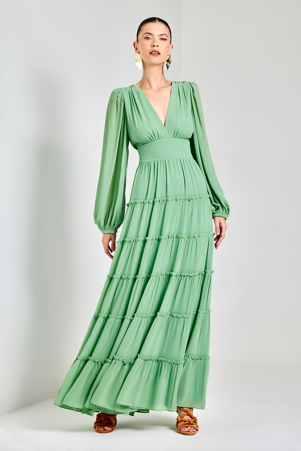 Elegante vestido longo com manga puff, possui uma saia ampla em camadas e babados delicados, o vestido é adornado por uma pala acinturada, realçando sua feminilidade de forma encantadora. O tecido escolhido possui leve transparência, proporcionando toque delicado e uma sensação de frescor ao look. Para uma combinação perfeita, sugerimos usar um salto delicados que ajudarão a alongar a silhueta, e uma linda bolsa para complementar o visual com estilo e sofisticação.